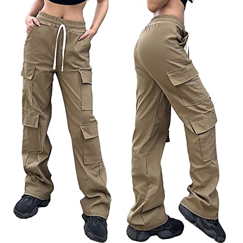 Nuofengkudu Womens Stretch Cargo Broek met Zakken Utility Elastische Hoge Taille Trekkoord Combat Werkbroek Tiener Meisjes Y2K Streetwear